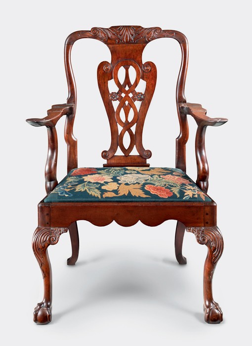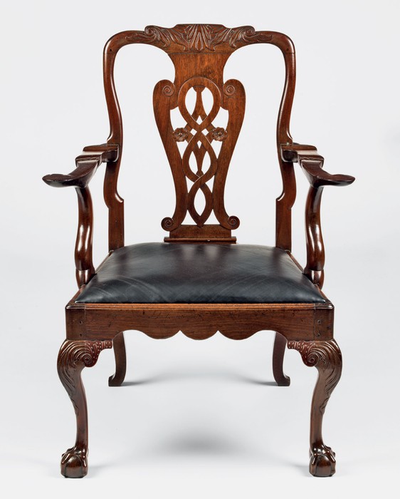 Armchair, vicinity of Edenton, North Carolina, 1745–1765. Mahogany and cherry with cypress and beech. (Courtesy, Museum of Early Southern Decorative Arts; photo, Gavin Ashworth.) This armchair is illustrated in the publication cited in fig. 2.