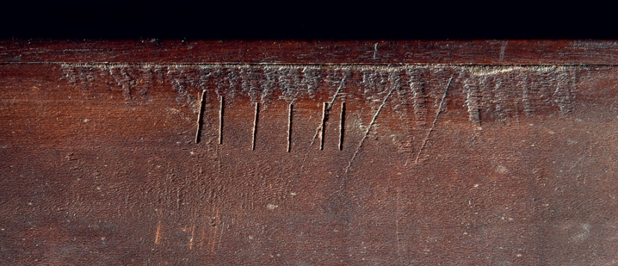 The armchairs have Roman numerals on their front and rear rails and slip seats, three of which are from different chairs: II, III, IIII, IIIII, IIIIII, VII, and VIII (fig. 15). The absence of only one number in the sequence—I—is the strongest evidence both that these chairs are from the same set and that the set numbered at least eight chairs. The use of different woods (yellow pine and cypress) for glue blocks is not evidence to the contrary, since blocks of this type were often cut from scrap, and previous visual identification of one rear seat rail as being beech was incorrect. All of the known chairs have cherry rear rails.