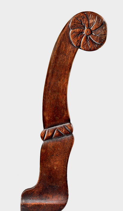 The armchairs illustrated in figures 9–12 are among the earlier carved furniture from the Edenton area, and it is likely that the carver and maker were the same individual. The example illustrated in figure 9 is branded “JOHN COX / EDENTON NC” (fig. 13). Cox (1788–1856) was a later owner who operated a shipyard and brickyard in Edenton.[10] Juliana Harvey Elliott (1819–1879) donated a virtually identical armchair to Holy Trinity Episcopal Church in Hertford, North Carolina, in about 1870 (fig. 11).[11] Located in Perquimans County, Hertford is approximately thirteen miles northeast of Edenton. How John Cox and Juliana Elliott came into possession of their chairs remains unknown, but both were from local families. Two additional armchairs of the same design are known, but neither has an early history (figs. 10, 12).[12]