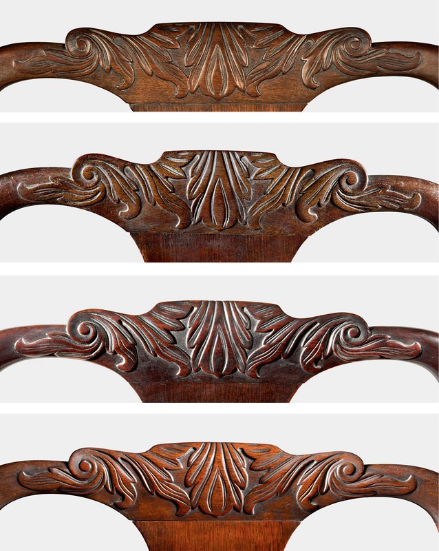 Details showing the crest rail carving of the armchairs illustrated (from top to bottom) in figs. 9–12. (Photos [lower three], Gavin Ashworth.)