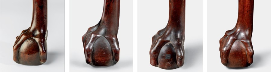 Details showing the claw-and-ball feet of the armchairs illustrated (from left to right) in figs. 9–12. (Photos [right three], Gavin Ashworth.)