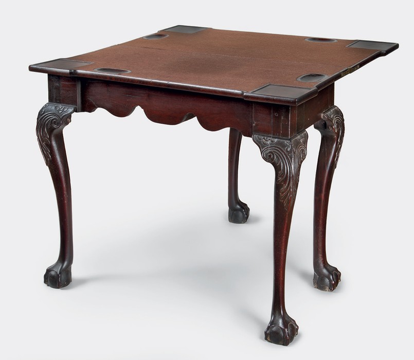 Card table, vicinity of Edenton, North Carolina, 1760–1775. Mahogany with oak, birch, and tulip poplar. H. 27 7/8", W. 31" (knees), D. 16" (knees). (Private collection; photo, Gavin Ashworth.) The top and knee blocks are replaced.