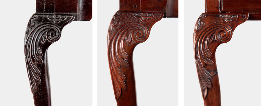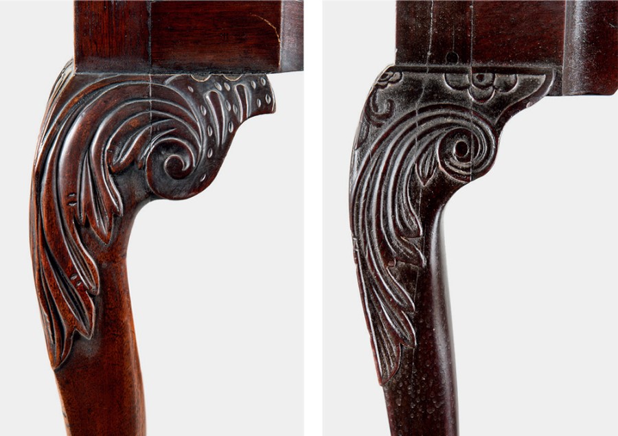 Detail showing the knee carving on the card table illustrated in fig. 35 (left) and the armchair illustrated in fig. 12 (right). (Photos, Gavin Ashworth.)