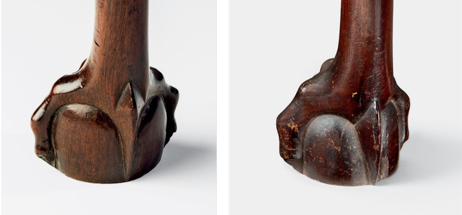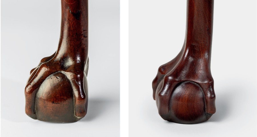 Details showing a foot of the armchair illustrated in fig. 9 (left) and of the writing table illustrated in fig. 41 (right). (Photo [on right], Gavin Ashworth.) These feet differ in almost every respect. The foot of the armchair has a taller ball and no webbing, whereas that of the writing table has a more flattened ball and webbing. These feet also differ in the modeling of the front and side toes.