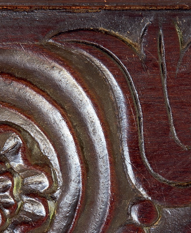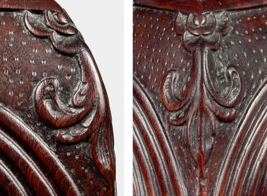 Although unconventional, the use of chip cuts to articulate the convex and concave surfaces of leaves occurred contemporaneously in furniture carving from other areas of the colonies, including Charleston, South Carolina.