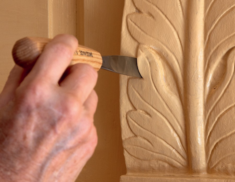 Eighteenth-century carving tools were handmade and less uniform than those available today, and the evidence they left behind depended on how they were used and how they were sharpened. For example, some carvers had gouges with a slanted cutting edge to provide additional clearance; and some V-tools had slightly rounded bottoms, making it difficult to distinguish between a cut made by them and a cut made by a veiner. Carvers could also use different tools to achieve essentially the same results. The outline of a leaf that corresponds to a specific gouge sweep, for example, can be set in using a larger tool with an identical or similar sweep, with a V-tool, or by dragging a skew chisel. Determining the tools used to model carving is even more problematic because of the many ways a carver could go about hollowing concave surfaces and rounding convex ones, the latter often achieved by using back-bent gouges or conventional ones inverted.[15]