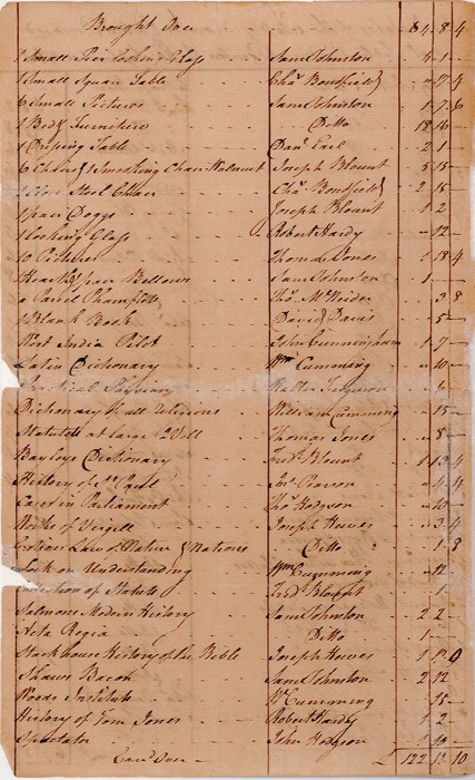 Estate Records of Francis Corbin, 1768, Cupola House Papers, 1744-1834, Chowan County Miscellaneous Records, CR.024.928.40, State Archives of North Carolina, Raleigh. On July 22, 1768, the Virginia Gazette reported, “to be SOLD at public vendue, for ready money, at the late dwelling house of Francis Corbin, Esq., deceased, on Tuesday the 20th of September next, ALL THE HOUSEHOLD & KITCHEN furniture of the said Francis Corbin; also a valuable collection of books; and sundry very likely country born SLAVES.” One of Edenton’s wealthier and more prominent citizens, Johnston was the principal buyer at Corbin’s sale. Among his many purchases were a pair of large looking glasses for £12.0.6, “2 square Mahogany Tables” for £4, a round mahogany tea table for £2, “1 Bed & Furniture” for £9, a dressing table for £3, a dressing glass for £1, several books, and an assortment of “china,” glass, and metal wares. The prices realized suggest that there was considerable competition among those who attended the sale.