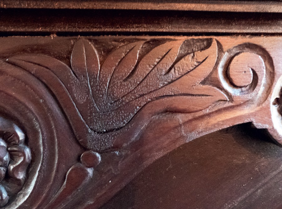 Close-up of the leaf carving on the bracket illustrated in fig. 7. (Photo, Rob Hunter.) As this detail reveals, the carver responsible for the work in the Cupola House had far more ambition than skill. The leaves are not modeled, their lobes are articulated with erratic “shading” cuts, and the ground is rough and uneven. Although not rising to the level of workmanship expected from someone trained as a carver, the leaf carving on the two groups of furniture illustrated and discussed here is far superior to the Cupola House work. The ground around the furniture carving is reasonably well controlled, and the leaves are modeled and shaded.