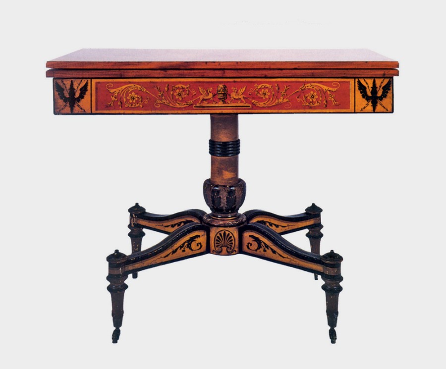 Card table, attributed to the shop of John and Hugh Finlay, Baltimore, Maryland, ca. 1815. Mahogany, tulip poplar, maple; painted and gilded decoration, baize, brass. H. 28 1/2", W. 36", D. 17 3/4". (Courtesy, Philadelphia Museum of Art, gift of the Stanley Weiss Collection in recognition of the scholarship of Alexandra Kirtley, Curator of American Decorative Arts, 2018; photo, Gavin Ashworth.)