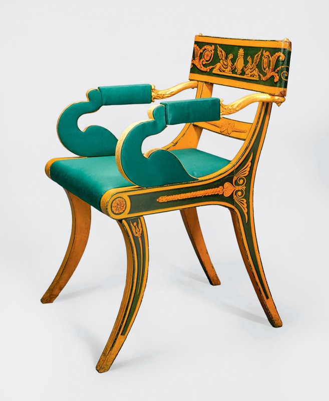 Armchair, attributed to the shop of John and Hugh Finlay, with crest rail medallion attributed to Francis Guy, Baltimore, 1803–1805. Maple and ash; painted and gilded decoration. H. 33 3/4", W. 21 5/8", D. 20 5/16". (Courtesy, Baltimore Museum of Art, gift of Lydia Howard de Roth and Nancy H. DeFord Venable in Memory of their Mother, Lydia Howard DeFord and Purchase Fund; photo, Gavin Ashworth.) This chair is from the “Morris” suite; its crest rail medallion depicts the St. Paul’s Charity School.