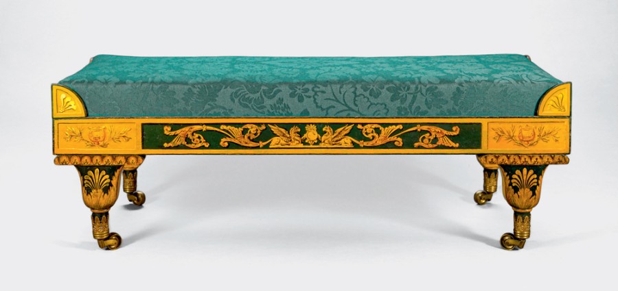 Recess seat, attributed to the shop of John and Hugh Finlay, Baltimore, ca. 1815. Pine, yellow poplar; painted and gilded decoration, brass, reproduction wool damask upholstery. H. 15 5/8", W. 46 1/16", D. 15 3/4". (Courtesy, Saint Louis Art Museum, funds given by the Decorative Arts Society.)