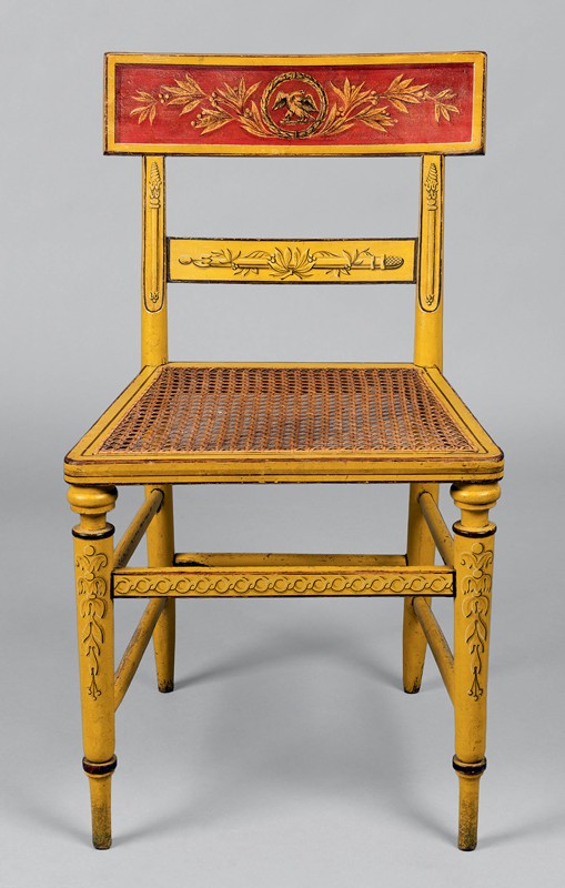 The city of Baltimore was abuzz with all of the activities involved in welcoming “The Nation’s Guest,” including a dinner hosted by the Society of the Cincinnati at James Buchanan’s mansion (fig. 10) and a dinner held by the Corporation of Baltimore at the Fountain Inn. Samuel Smith’s brother-in-law and neighbor William Patterson (1752–1835) served on the committee of arrangements that was given authority by the city to plan for and purchase the decorations for Lafayette’s welcome and dinner at the Fountain Inn.[43] While the Finlays were well known for undertaking such events, their extensive furnishings for the Assembly Rooms may have taxed their capacity. Patterson and his committee needed to turn elsewhere for some of their decorations and furniture and commissioned six dozen fancy “Cane seat chairs” from Baltimore chairmaker John King (active 1808–1829), whose shop for nearly a decade had been at 24 North Gay Street (old number), just several doors away from the Finlays.[44] For the event, Hugh Finlay only produced four pier tables, apparently fancy, which were lent with marble tops to be returned. Little-known miniaturist Joseph Weisman (dates unknown) was commissioned to paint eighty “Portraits of General LaFayette on chairs & Tables,” apparently decorating both King’s and Finlay’s pieces.[45] After the event was over, the city sold all the items they had commissioned for the dinner, with Patterson acquiring at least “1 Doz: La Fayette Chairs.” From this large commission, only three chairs and one pier table are known to survive, all with history of being owned by Patterson (figs. 16, 17).[46]
