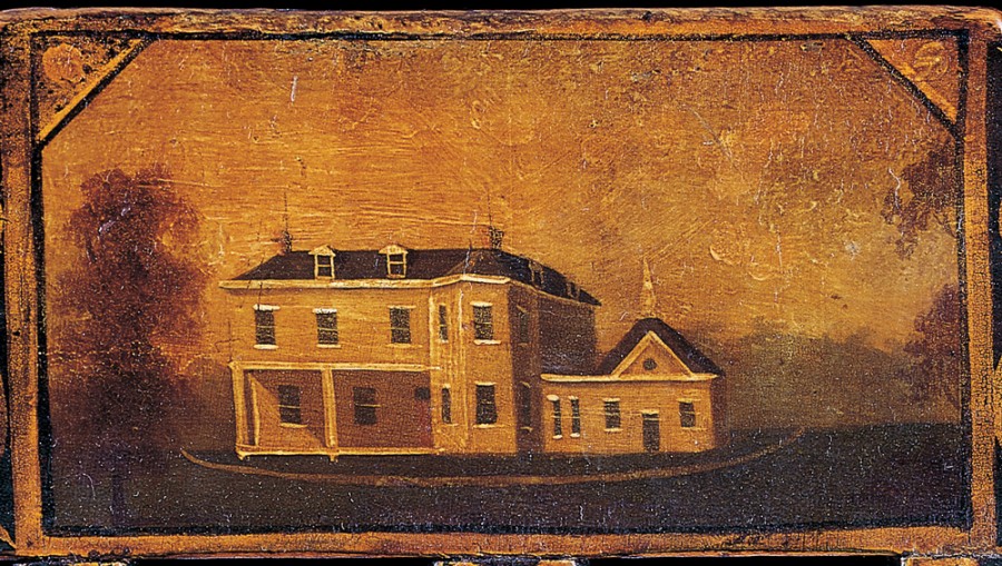 Detail of a card table attributed to the shop of John and Hugh Finlay, with skirt medallion attributed to Francis Guy, Baltimore, 1803–1806. Tulip poplar and pine with oak. H. 28 3/4", W. 38 5/8", D. 17 1/2". (Courtesy, Winterthur Museum, Library & Garden.) This medallion depicts the paired mansions built in 1799–1801 by James A. Buchanan (left) and John Hollins (right). The card table was part of a suite made for Buchanan’s sisters, Sydney and Peggy Buchanan, who lived on Gay Street. For an image of the table, see Humphries, “Patronage, Provenance, and Perception,” in American Furniture (2003), p. 162, fig. 32.