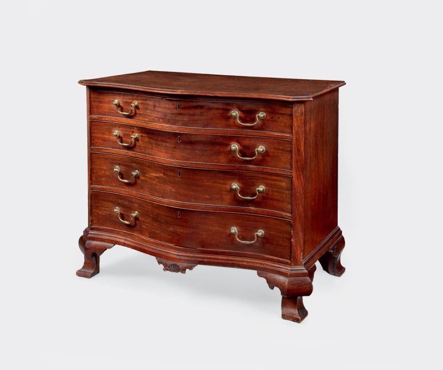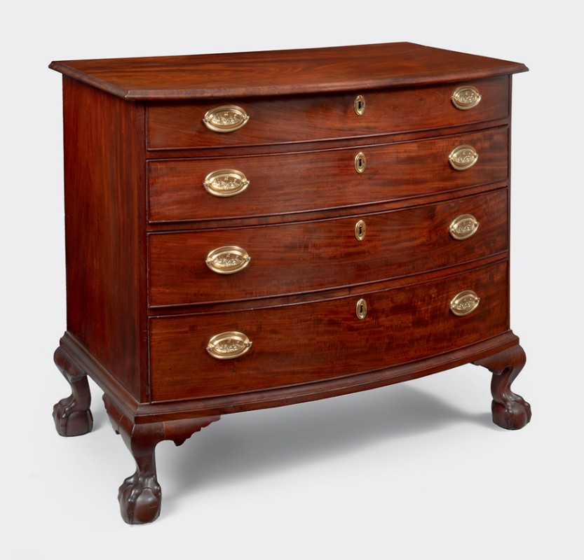 Chest of drawers, attributed to the shop of Thomas Needham Jr., Salem, Massachusetts, 1780–1787. Mahogany with white pine. H. 33 1/2", W. 46", D. 23 5/8". (Photo, © 2024 Museum of Fine Arts, Boston.)