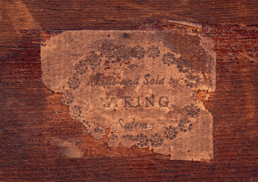 IN JANUARY 1925, New York antiques dealer Charles Morson sold a serpentine chest of drawers to noted collector of early American furniture Mrs. J. Insley Blair (1883–1951) (fig. 1).[1] Pasted on the back of the chest was a tiny, printed label, measuring just one and a half inches in length, which read: “Made and Sold by W. KING, Salem” (fig. 2). The name meant little to the dealer or the purchaser; more likely, it was the unusual swell of the front feet that attracted their attention. The pattern also caught the eye of the editor of the magazine Antiques, Homer Eaton Keyes (1875–1938). In the September 1927 issue of the magazine, he pondered the difficulty of designing a serpentine chest. To Keyes, the challenge lay in the transition from a curved front to the straight sides. To relieve the awkwardness, many craftsmen inserted a canted corner post and set the case on bracket feet, but with limited success. The design usually resulted in “an ugly and seemingly disproportionate bracket foot,” noted Keyes. Cabinetmaker William King (1762–1839), however, adopted a unique solution that featured a swelled block at the top of the foot. Though some might consider King’s design peculiar and ungraceful, Keyes claimed the opposite. “It would be hard to find anywhere in furniture history,” wrote Keyes, “a better example of ingenious and artistic adjustment of transitional lines.”[2]