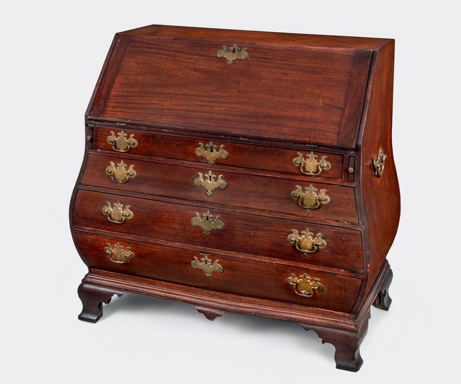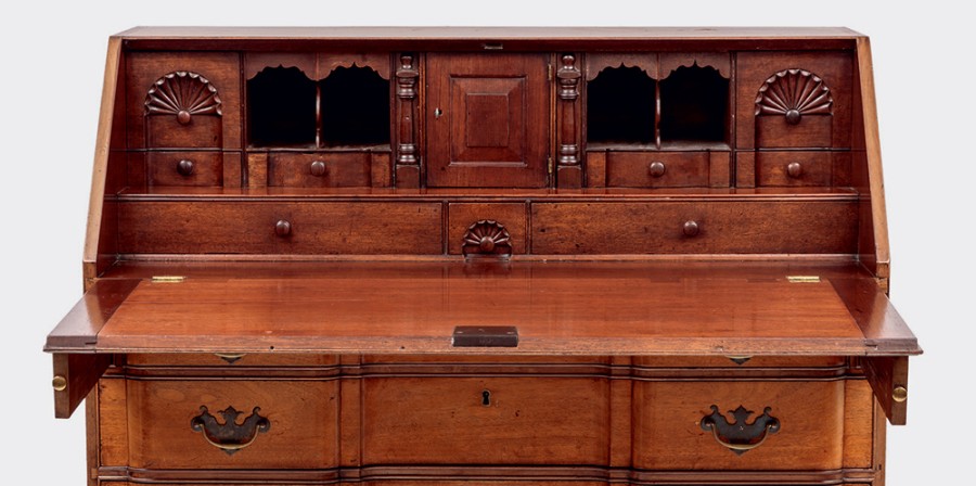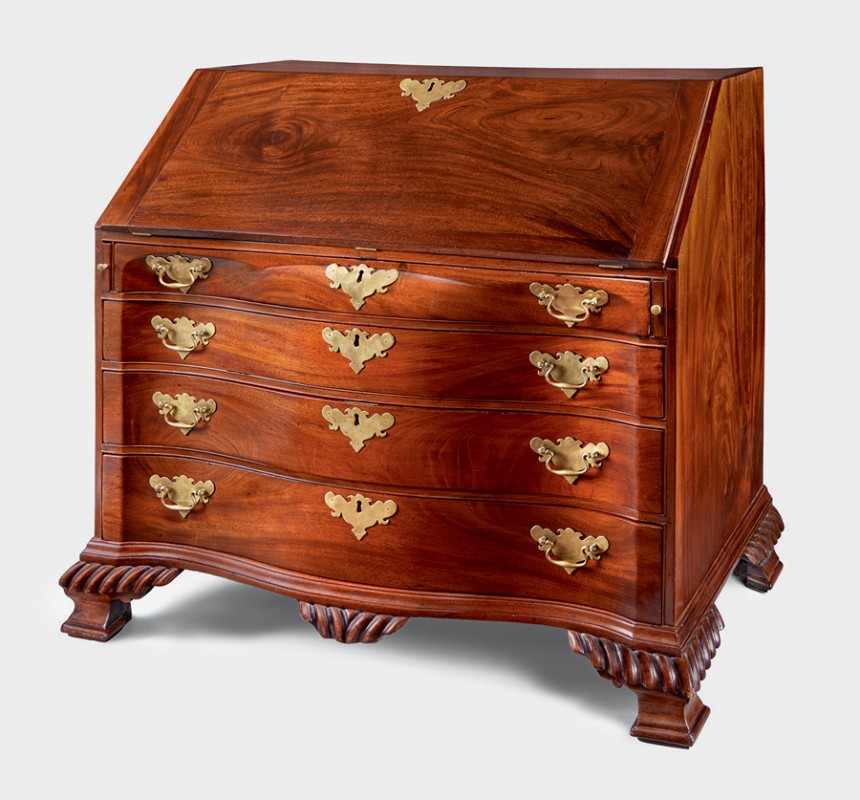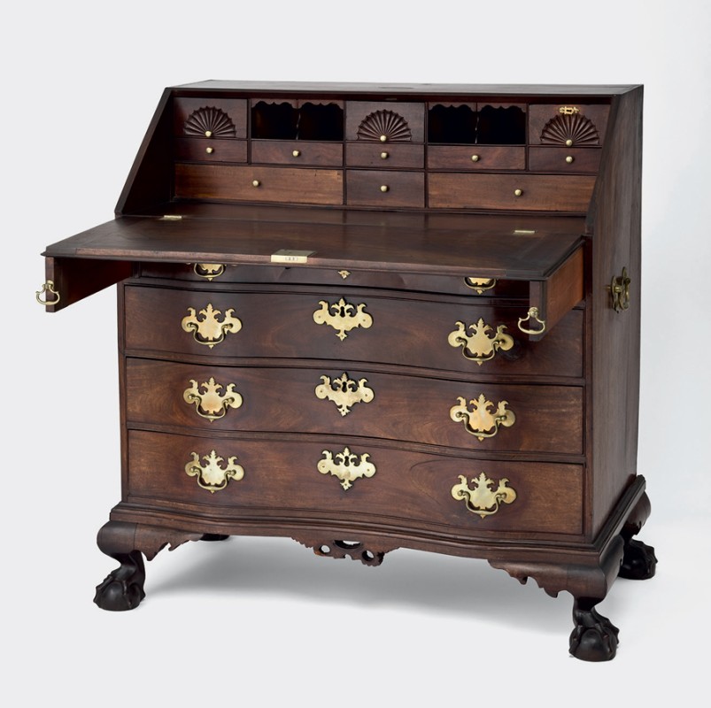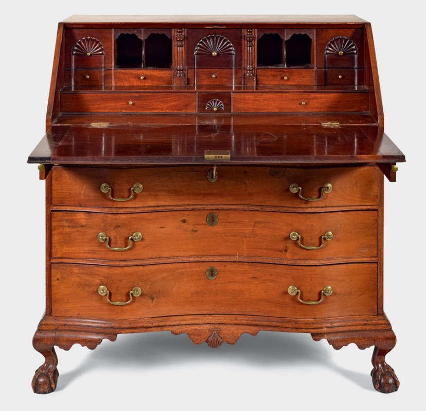 Desk, Salem-Ipswich area, Massachusetts, 1780–1795. Mahogany. H. 42 3/4", W. 41 1/4". (Private collection; photo, Sotheby’s.)