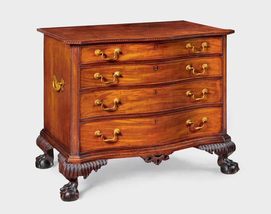 Chest of drawers, attributed to the shop of Thomas Needham Jr., Salem, Massachusetts, 1780–1787. Mahogany with white pine. H. 31 3/4", W. 41 1/4", D. 23". (Private collection; photo, Gavin Ashworth.)