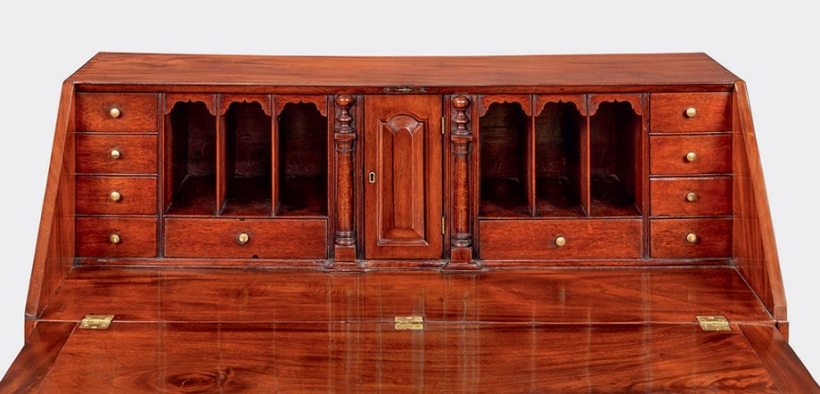 Desk, Salem area, Massachusetts, 1780–1795. Mahogany with white pine. H. 41 3/8", W. 47 1/4", D. 25 1/4". (Private collection; photo, Gavin Ashworth.)