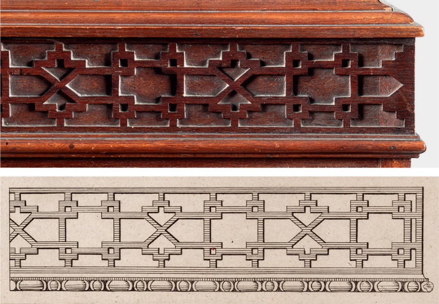 Comparison of the fretwork on the chest-on-chest in fig. 40 and a detail of the design for “Two New Frets proper for Trays or Fenders” shown on pl. 6 of John Crunden’s The Joyner and Cabinet-Maker’s Darling (London, 1765). (Photos, Gavin Ashworth [top] and Winterthur Museum, Garden & Library [bottom].)