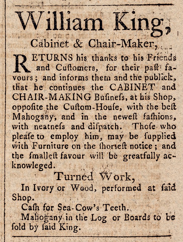 Back in Salem, King took up his trade once again, promoting himself as an ivory turner through a series of advertisements. The first offered such goods as “genteel” canes, billiard balls, dice, chess pieces, and lemon squeezers at his shop across from the dwelling house of Colonel John Fisk.[20] A notice of July 14, 1789, announced the relocation of his business to a passage leading to the Salem Common. At the new site, he carried on “Cabinet Work, in its various branches,” in addition to his usual decorative turning.[21] By 1792 he had moved again, this time to a site opposite the Custom House, where he had for sale “a parcel of Excellent Mahogany in large or small quantities.”[22] He also proposed to hire two journeymen in the cabinet and chair-making business.[23] The next year, he published the most detailed announcement of his furniture operation, noting that “he continues the CABINET and CHAIR-MAKING Business . . . with the best Mahogany, and in the newest fashions, with neatness and dispatch” (fig. 5).[24]