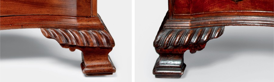Keyes’ article sparked considerable interest in the talented but tainted artisan. Mrs. Blair received several inquiries from scholars and dealers, and in 1930, a second Antiques article credited King as the maker of a related chest of drawers with an impeccable Salem history (fig. 3). It too displayed a serpentine front with canted corners and a carved pendant drop, although the author, Willard Keyes (1861-1959), staked the attribution on the carving of the feet (fig. 4). He interpreted the band of decorative reeding, termed gadrooning, as a carved version of the bold swell on the front feet of the documented chest.[6] In retrospect, the comparison seems a stretch, considering the obvious difference between the ogee bracket base on one chest and claw-and-ball feet on the other. Yet, the connection to King took hold, and over the next ninety years every Massachusetts case piece with gadrooning along the upper half of the feet acquired an attribution to this single Salem cabinetmaker. This article takes a fresh look at William King and the objects associated with him.