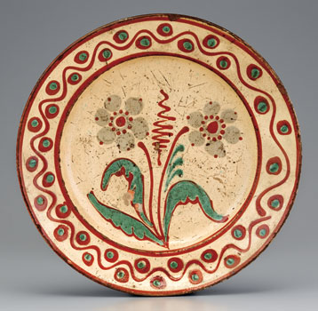 Dish, probably made during Rudolph Christ's tenure as master of the pottery at Salem, North Carolina, 1790-1810. Lead-glazed earthenware. D. 12 1/2".