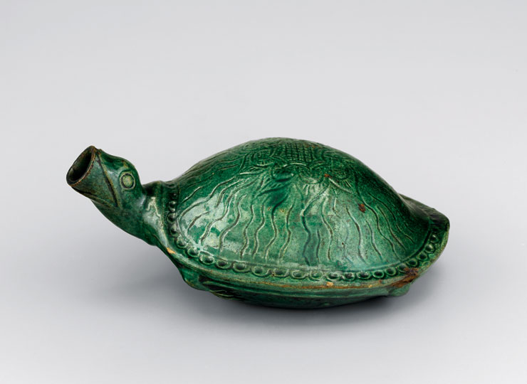 Turtle bottle, Salem, North Carolina, 1800-1820. Lead-glazed earthenware. L. 8 1/2".