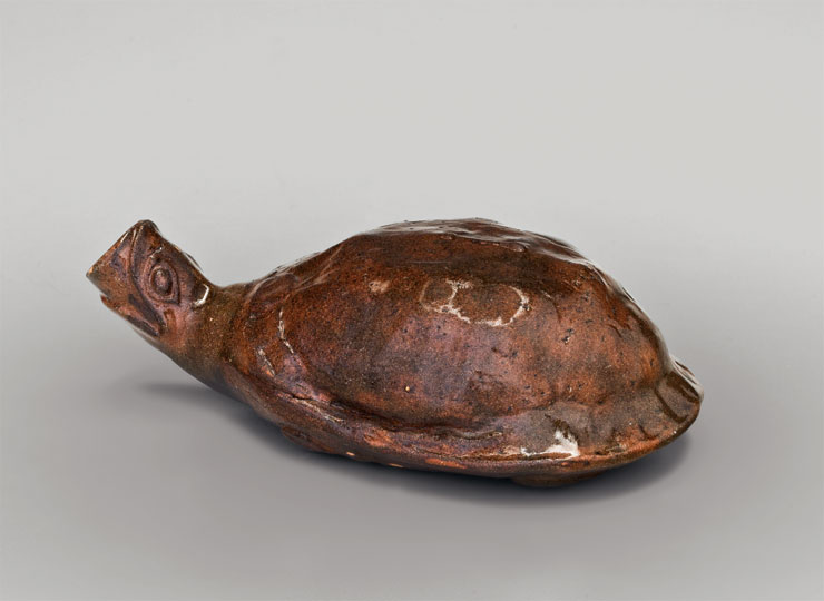 Turtle bottle, Salem, North Carolina, 1800-1820. Lead-glazed earthenware. L. 7 1/4".