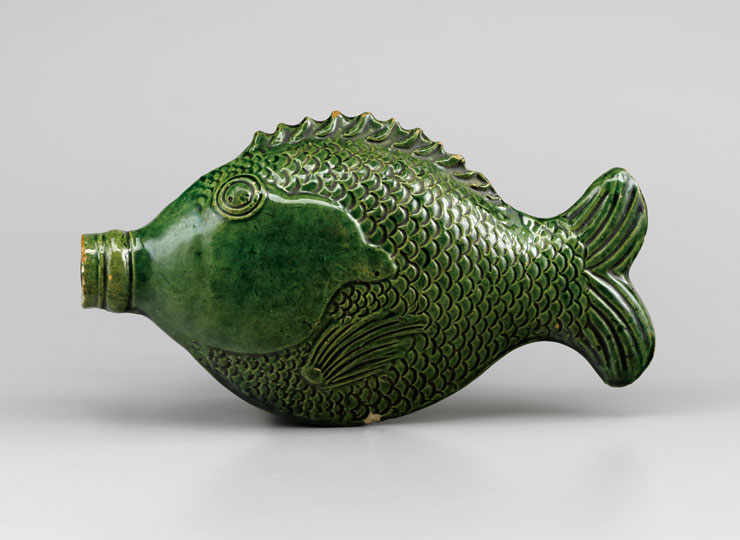 Fish bottle, Salem, North Carolina, 1801-1829. Lead-glazed earthenware. L. 6".