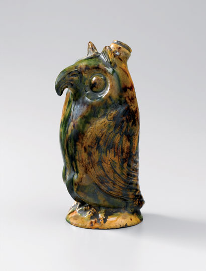 Owl bottle, Salem, North Carolina, 1804-1840. Lead-glazed earthenware. H. 7 3/4".