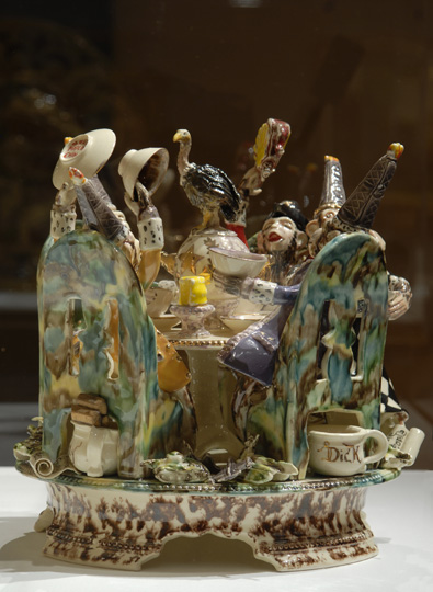 Erickson created the satirical Texas Tea Party in response to the energy and environmental policies of George W. Bush’s administration. The design is based on mid-eighteenth-century English ceramic figural groups, which typically showed people engaged in conversation or, more uncommonly, drinking tea or punch. Erickson converts the expressionless faces found on the original figures into animated colonial caricatures of Bush. Adorned with oil rig party hats, the revelers drink sweet crude from lusterware teacups and eat “yellow cake,” which is an allusion to uranium. Each figure has a personalized chamber pot filled with gold bricks, a commentary on the relationship between money, oil, and power. A discarded constitution becomes useful in a most unexpected way, while tools of war are scattered like playthings around the base. Atop the central kettle is a vulture, a pointed replacement of the American eagle. Bush wields a familiar logo-shaped teapot as the giddy Secretary of State sits on his knee. In every respect, this group, feasting on the policies that have made them rich and powerful, appears to be oblivious to the outside world.