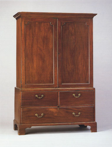![]() | John Selden Norfolk, Virginia, 1775 Mahogany with yellow pine Long-term loan from Mr. and Mrs. Charles Hill Carter Catalog no. 121 Design for a Clothes Press (plate CII) Thomas Chippendale The Gentleman and Cabinet-Maker's Director (1754) The mahogany clothespress displayed here is one of the original furnishings at Shirley plantation, the home of the Carter family in Charles City County, Virginia. Dated 1775, the piece was acquired by the Carters about the same time they began a substantial renovation of Shirley. Signed by Norfolk cabinetmaker John Selden, the press is one of the best examples of how regional makers sometimes relied on published design sources. Selden worked in Norfolk for nearly twenty years before losing his shop in a fire that destroyed the city in 1776. He then relocated to Blandford, near Petersburg, where he offered local patrons a wide range of British-inspired furniture forms. | |