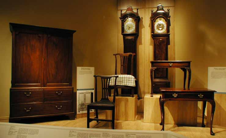 | Several Irish cabinetmakers worked near the lower Rappahannock River in the vicinity of Tappahannock, Virginia, between 1740 and 1760. Although these artisans used native Virginia woods such as cherry, black walnut, and yellow pine, the Irish origin of their designs is unmistakable. Compare the overall form of the Rappahannock table on the left with the Irish table on the right. In particular, note the striking correspondence between the apron shape, cabriole legs, carving on the knees, and form of the feet. |