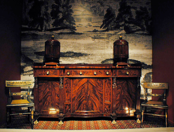 This massive sideboard is typical of Baltimore furniture in the late classical style. It is ornamented in the rich Egyptian and Gothic style. Gothic ornamentation appears in the form of pointed arches and quatrefoils, while the ogee central arch is of Moorish origin. The caryatids on the facade were called tapered therms with mummy heads and feet in local documents, although the bearded and turbaned heads are more Turkish than Egyptian. The shafts that support the heads and the carved human feet have direct parallels in early Egyptian design, however. The abandon with which Gothic, Egyptian, Turkish, Moorish, and other elements were mixed and matched on this sideboard and on many other Baltimore pieces indicates that purity of design and archaeological correctness were not of paramount importance to some consumers.