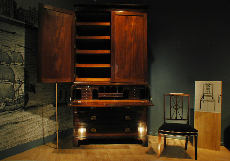 Lee was working in Charleston by 1804 and remained there until his untimely death at age thirty-four. One of many local cabinetmakers of Scottish origin, Lee ran a moderate size furniture business. Built for the wealthy Ball family, this clothespress is similar to other Charleston-made examples in several ways. Although unusually conservative in style, its great height (nearly eight feet) and the inclusion of a secretary drawer are typical of Charleston presses of the early national period.