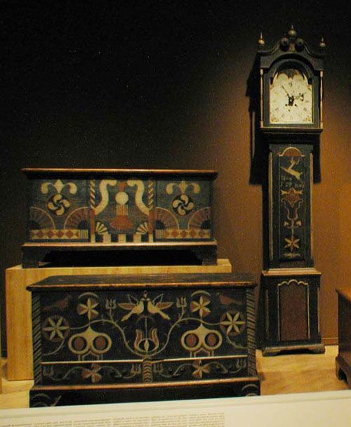 The significance of the stylized clock image on the chest is not fully understood. Many ideas remain to be explored, including the German- and Swiss-American fascination with time. More also needs to learned about the case furniture that Spitler painted. Structural variations suggest that at least two or three shops made furniture for Spitler. Nevertheless, these chests and clock represent the hand of a single maker, one whose emphasis on sturdy elements and solid wooden pin construction indicate an awareness of German or Swiss craft traditions.