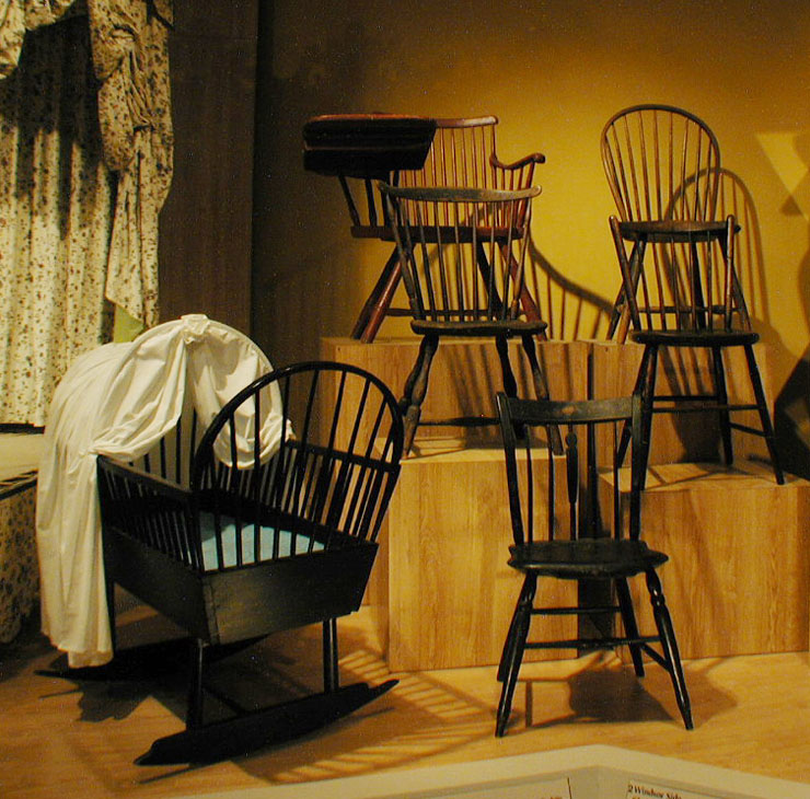 The open wooden structure of a Windsor cradle was conceived as an inexpensive frame for the textiles associated with infant bedding. On the present example, a detachable hoop at the center was designed to be slipped through a casing at the front of a curtain assembly that enclosed the head of the bed. According to The Workwoman's Guide (1838), such covers were designed to guard the infant from the sun, or from draughts of air, while asleep, and to give an air of comfort and cleanliness.