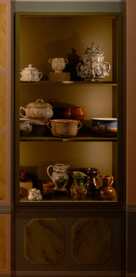 Chamber pots – also known as thunder mugs and piss-pots – are among the oldest and most important ceramic forms, yet they rarely are seen in museums. Although somewhat similar in form to the earliest European cooking pots, chamber pots had wider rims, stronger handles, and sometimes convenient lids. The examples on this shelf span more than 300 years, from a seventeenth-century Dutch version to an example featuring Hollywood star Rudolph Valentino as Lawrence of Arabia. While chamber pots are