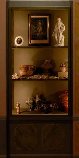 The pottery in this cabinet is not old. These pieces were made relatively recently to be sold deceitfully as genuine antiques. The white bust of Maria Theresa, Archduchess of Austria, is a circa 1980 stone china copy that was