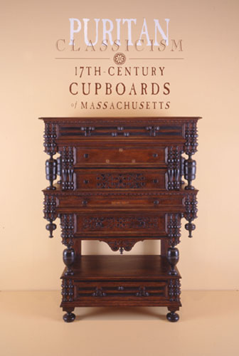Cupboard, dated 1683 Ipswich or Newbury, Massachusetts Oak and maple Lent by a private collection This unusual cupboard is filled completely with drawers and sports jetties, or overhangs, like those of a house. It was made for Abraham Perkins (1641—1722) and his wife Hannah Beamsley Perkins (1643—1732) of Ipswich, who were married in 1661. It may have commemorated the marriage of the Perkins’ daughter Hannah to a prominent woodworker named Daniel Rindge, Jr. (1658—1738). In 1698, Abraham Perkins underbid two other prominent Ipswich carpenters, Abraham Tilton Sr. (1638—1728) and Abraham Tilton Jr. (1666—1756), to secure the prestigious contract to build a new meetinghouse in Ipswich. Undoubtedly Perkins was bidding on behlf of Rindge, his son-in-law, who then became the principal contractor. Daniel Rindge’s prominence in the woodworking trades and his prosperous in-laws make him an important candidate for master of the shop tradition which made the cupboardsthat is, he may have originated the style in Massachusetts and trained apprentices who made similar objects. The Pekins cupboard was restored last year based on period workmanship and scholarly study of all the related cupboards. This is its first public viewing.