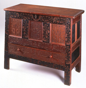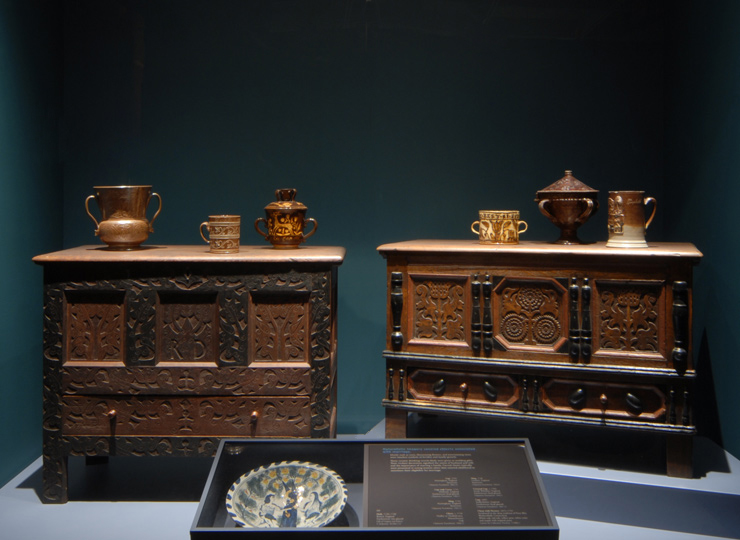 These ceramic drinking vessels likely were given as wedding gifts. Their verdant decoration signified the union of husband and wife and the importance of starting a family. Carved chests typically were presented to young women when they entered adulthood to announce their eligibility for marriage.