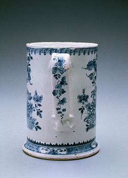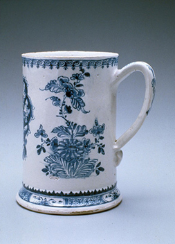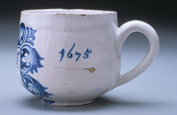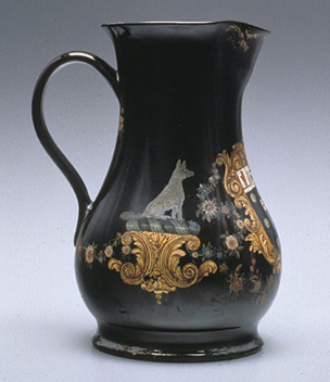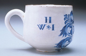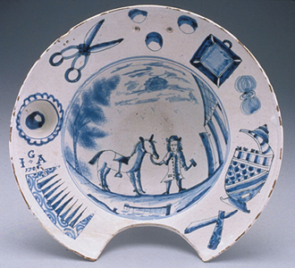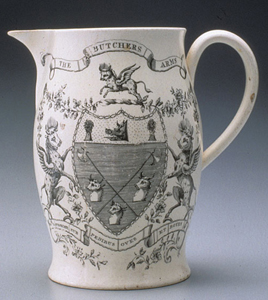 The top shelf features early English pottery decorated with the emblems of specific guilds, the predecessors of present-day trade unions. Look closely at the decoration and see if you can identify the shields of the butcher and poulterer guilds.