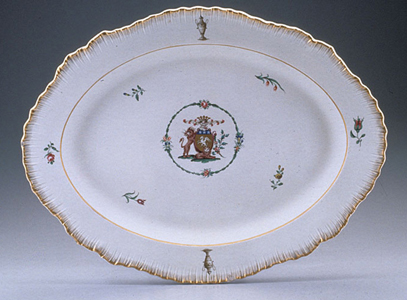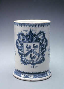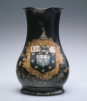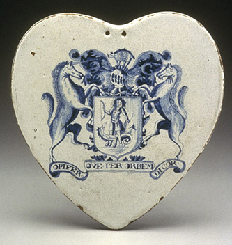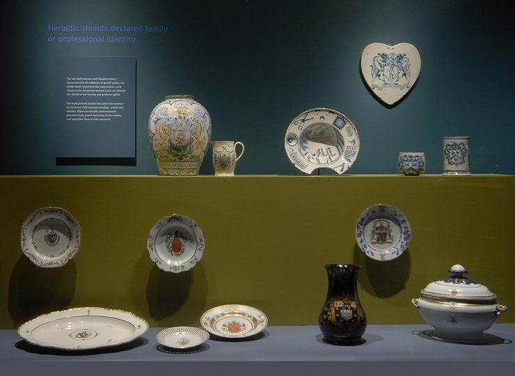 The hand-painted shields that adorn the ceramics on the lower shelf represent wealthy, aristocratic families. Elaborate heraldic ornament proclaimed the power and status of the owner, and reminded the present generation of its ancestors.