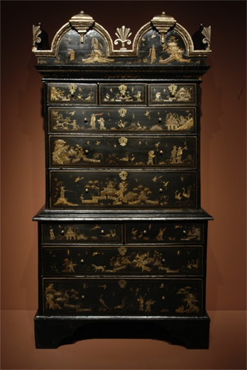 Long popular in Japan, China, and India, lacquered furniture first was imported to Europe around 1600. In England, nobles and aristocrats prized its hard and glass-like surface, which was created by applying hundreds of individual layers of tinted lacquer. European furniture decorators came up with a less time-consuming imitation. First they painted or stained a wood surface; second, they adorned it with pictures made from layers of white gesso; then they covered the whole piece with several coats of shiny varnish. Dubbed "japanning," this process became extremely popular in England in the 1680s and stayed in vogue for more than half a century.
