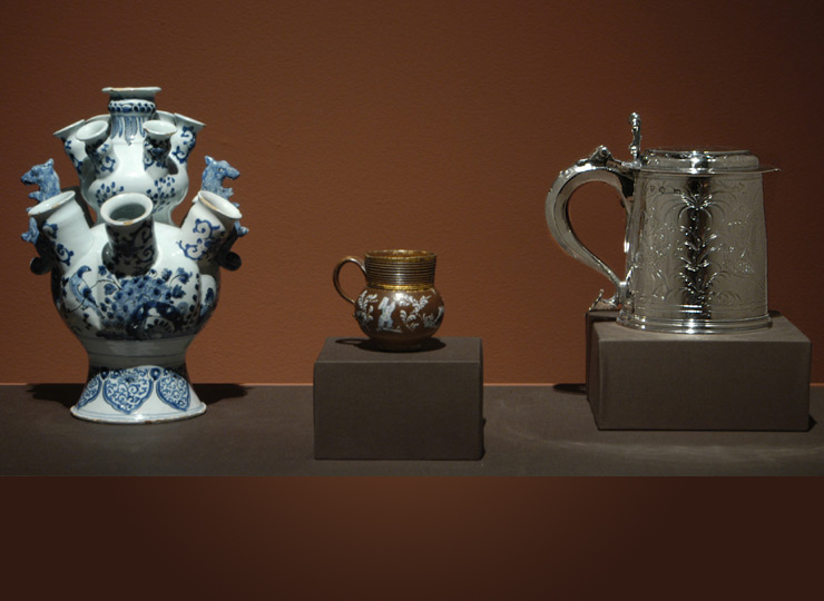 Mixing dissimilar motifs in surprising ways enhanced the "antick" character of Chinoiserie objects. The twelve-nozzled vase seen here features Japanese-style karakusa scrolls painted around the foot paired with sculpted animal heads whose tails become handles in the style of Italian grotesques. It would have held tulips, which were first brought to Europe from the Near East a century earlier. Other objects, including this mug and silver tankard, are adorned with carefree adaptations of foreign motifs. The joyously animated man on the enamelled stoneware mug is a quintessentially "antick" character.