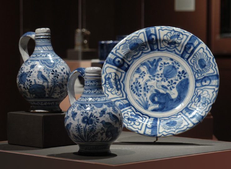 These early wine bottles and small dish were made before Chinoiserie became widely popular. All three are close copies of real Chinese blue-and-white porcelain, which first was imported into England around 1600 by the English East India Company. English potters still did not understand the delicate art of making porcelain, a ware distinguished by its glass-like body that could be potted so thin that it let light through. Instead late seventeenth-century potters made earthenware imitations that have opaque white glaze adorned with blue cobalta technique introduced to England by Christian Wilhelm and other immigrant Dutch potters.