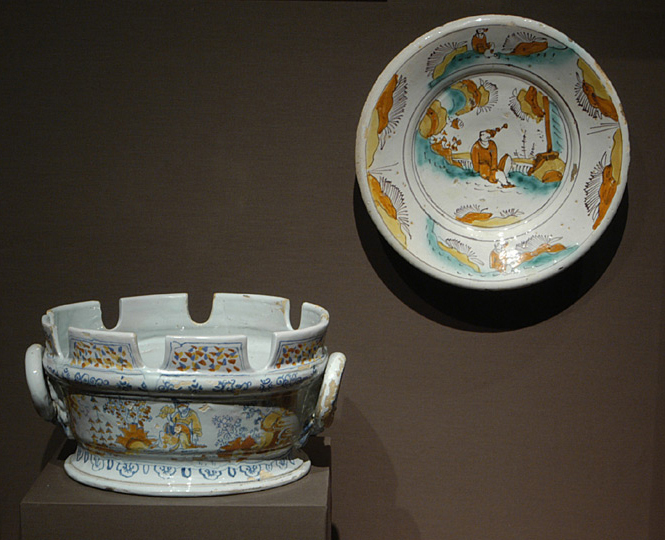 Potters in the production centers of Bristol and nearby Brislington specialized in the use of yellow and orange enamels as well as bright turquoise glazes. The English addition of color to the traditional blue-and-white palette may have been influenced by new types of imported porcelain. In 1683 the Chinese Imperial kilns reopened after a civil war and began producing wares adorned with green, red, and yellow enamels, which in the West came to be known as Famille Verte. Japanese wares with dark red and gold colorscalled Imariand with light blue, orange, and yellow enamelscalled Kakiemonfirst appeared in Europe even earlier. English potters adapted these imported patterns using the colorful enamels they already applied to European style tin-glazed ceramics.