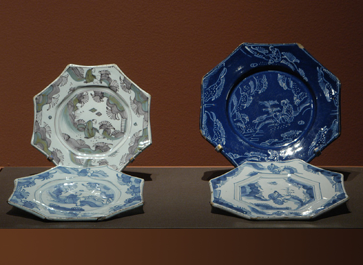The pair of blue-on-white plates at the front of this case reveals the expediency with which some English potters applied the "Chinese Figure" pattern. Both have indented centers molded in the shape of an octagon to match their exterior edges, but the center panel of the right-hand plate was painted with an inconsistent outline a circle instead of an octagon.