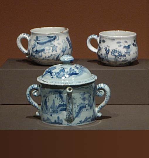 "Caudle cups" were originally meant to hold a drink made of warm ale or wine mixed with bread or gruel, eggs, sugar, and spicesa concoction administered to women after childbirth and to sick people. Over time, caudle cups also were used for ceremonial and formal dining occasions. Both of these examples feature blue-on-white decoration inspired by Chinese porcelain. The cup on the left also has thin lines of purple bordering, created by adding manganese oxide powder to the wet glaze surface before firing. Known as "trekking," this technique originated in Hollands Delft factories and came to England with immigrating potters. The other caudle cup incorporates familiar features of Chinoiserie decoration: a meandering fence, clustered clouds, and unusual foliage. However, all of the figures are wearing western costume, including the cloaked man with the tall brimmed hat.