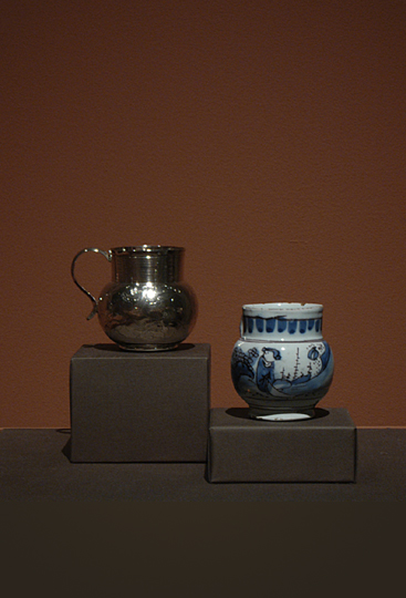 London silversmiths catered to the fashion-conscious elite and played a key role as leading tastemakers. Their work strongly influenced English potters, who copied the latest silver designs, as demonstrated by two mugs shown here whose shapes are nearly identical. The plants and figures flat-chased into the silver mug are oriented vertically in a conventional European layout, while the Chinese Figure pattern on the ceramic mug features diagonal lines that wind around its body, a composition more true to Asian aesthetics.